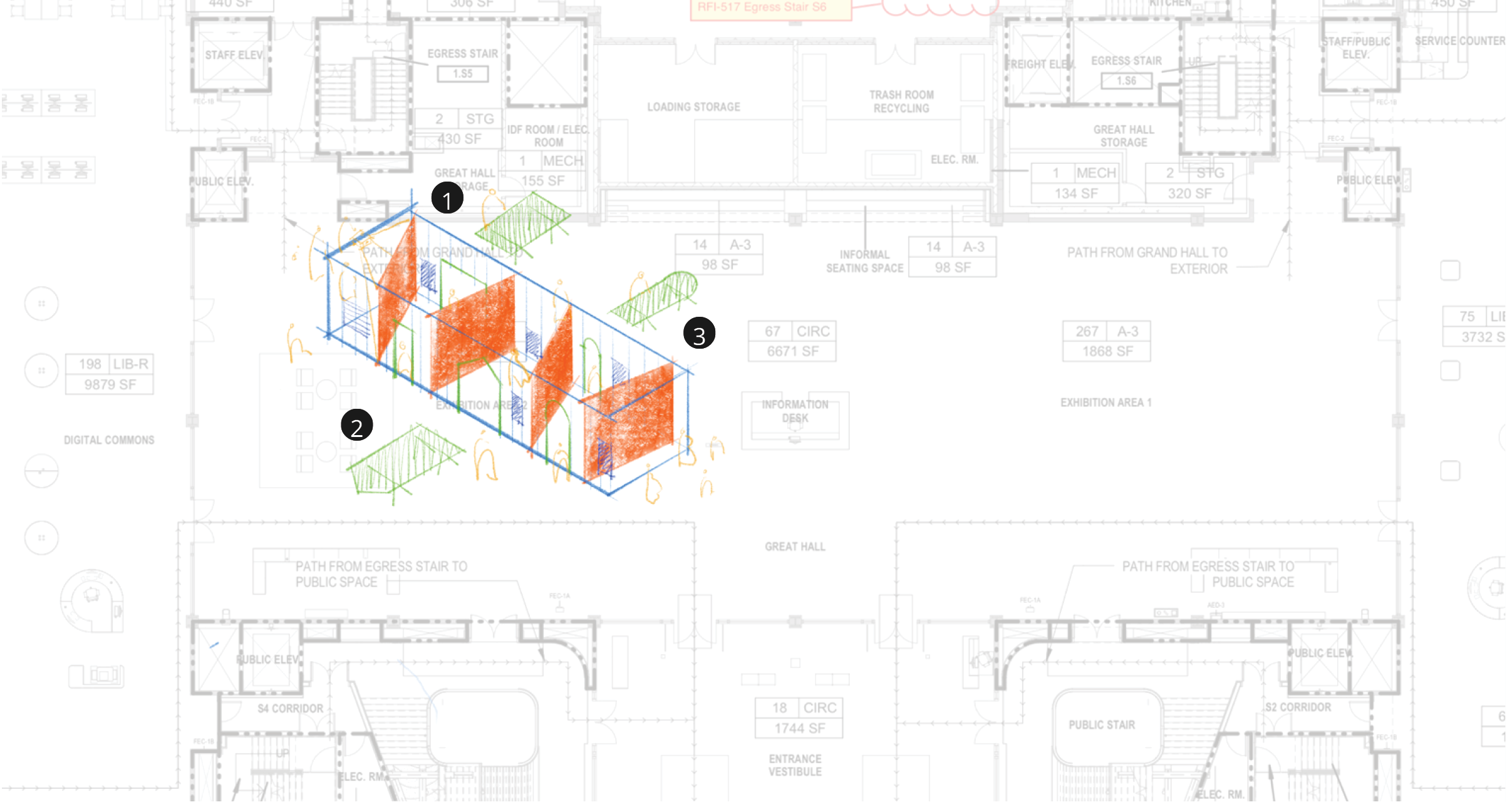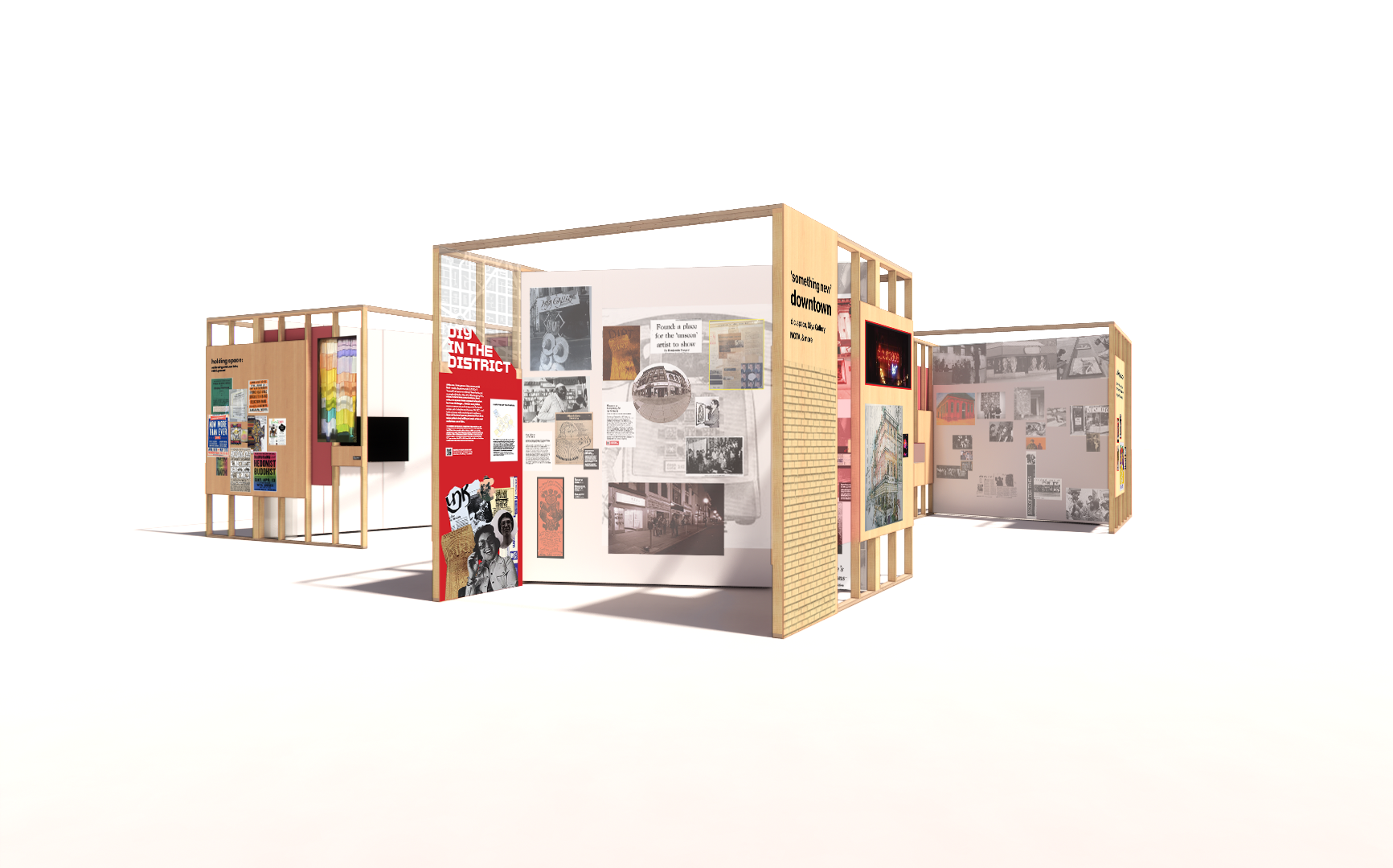 The design celebrates the resourcefulness and experimentation of artists working outside traditional institutions. Our goal was to transform the Great Hall into a vibrant hub that showcases Washington, D.C., as a perennial center of innovation. The initial concept draws on the DIY aesthetic of domestic spaces, juxtaposing exposed building materials with the grand scale of the room. To house the exhibit’s three themes, we proposed three "rooms": "Something New" Downtown (the history of DIY groups), Unlikely Spaces (buildings and venues), and Holding Space (a celebration of the ongoing artist-run scene).